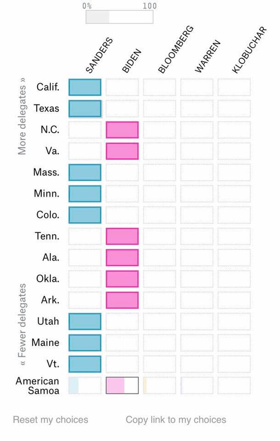 9:21 pm. AL SC NC TN OK. Biden is running up a big delegate lead, mostly in states that Democrats won’t win in November.