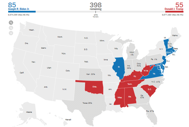The first returns are in. Trump wins Indiana. No surprise. Everything else is too early to call. Trump looks like he’s leading in Florida, because of two, R leaning counties. So far he’s short of his 2016 totals, but it’s too early for that to mean anything.