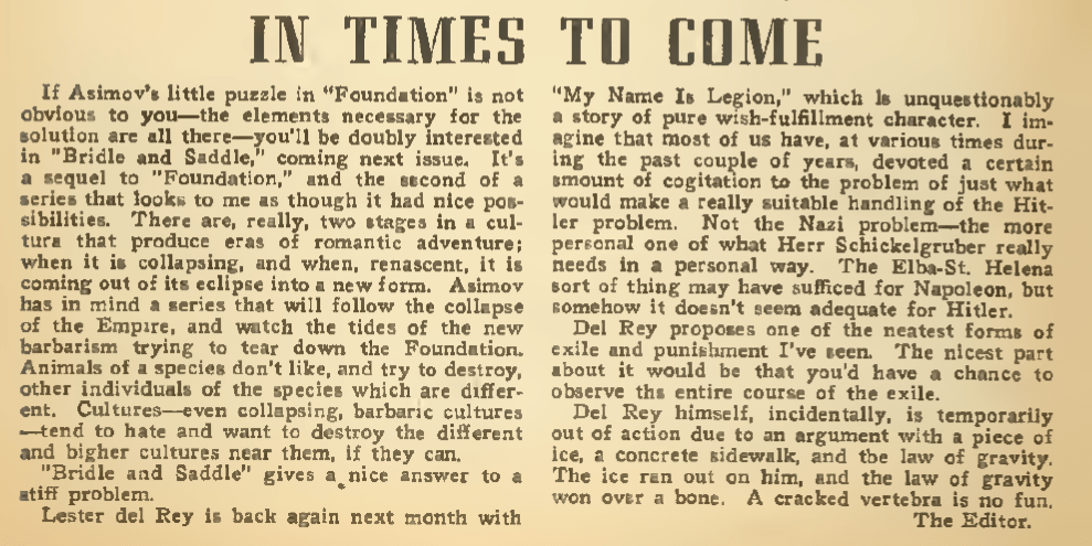 Of course, we now know “Bridle and Saddle” as “The Mayors,” the title it was given in Foundation.