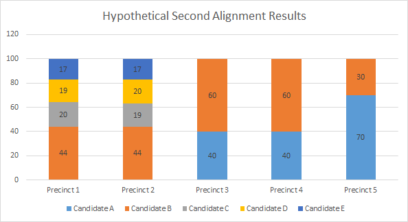 Notice that there are non-viable candidate preference groups in each precinct. These voters will have to join a viable group in order to participate. They may reorganize themselves as shown below.