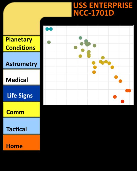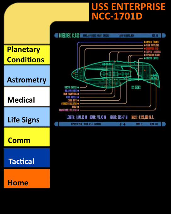 A home page with the UFP Logo, three astrometrics faces, two each of planetary conditions, tactical, and medical faces, one face that appears to scan for life signs and a face that looks as though a communications system is active.