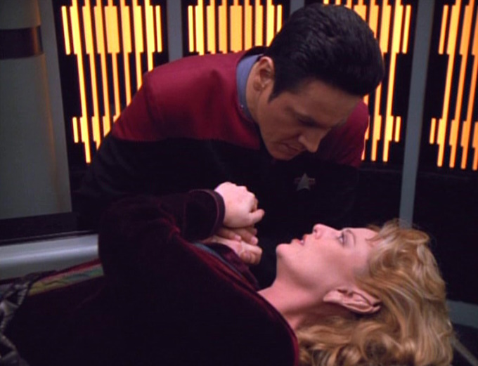 Sigh. The Kazon. I don’t like the Kazon. Kes makes little impression at first, but it’s better when she starts playing Jiminy Cricket for Neelix. We learn the Ocampa are in decline due to over-dependence on the Caretaker.
