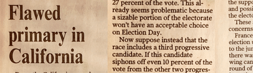 Top-two simply isn’t a good idea. Our country desperately needs voting reform, but top-two isn’t voting reform, it’s doubling down on all the inherent problems of the plurality vote and making them a bit worse. Do you want real voting reform? Look for a group promoting instant run-off voting like they do in Maine, even better IMO, approval voting. The links take you to organizations doing just that.