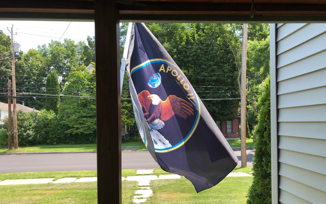 This year, we are flying an Apollo 11 flag. Well, kind of. We’re flying a flag that was marketed as an Apollo 11 flag. But it’s probably something that was cooked up for the semicentennial. It’s just the Apollo 11 mission patch on a black background. Vexillologists would call this a seal on a bedsheet like most of the state flags in the US.